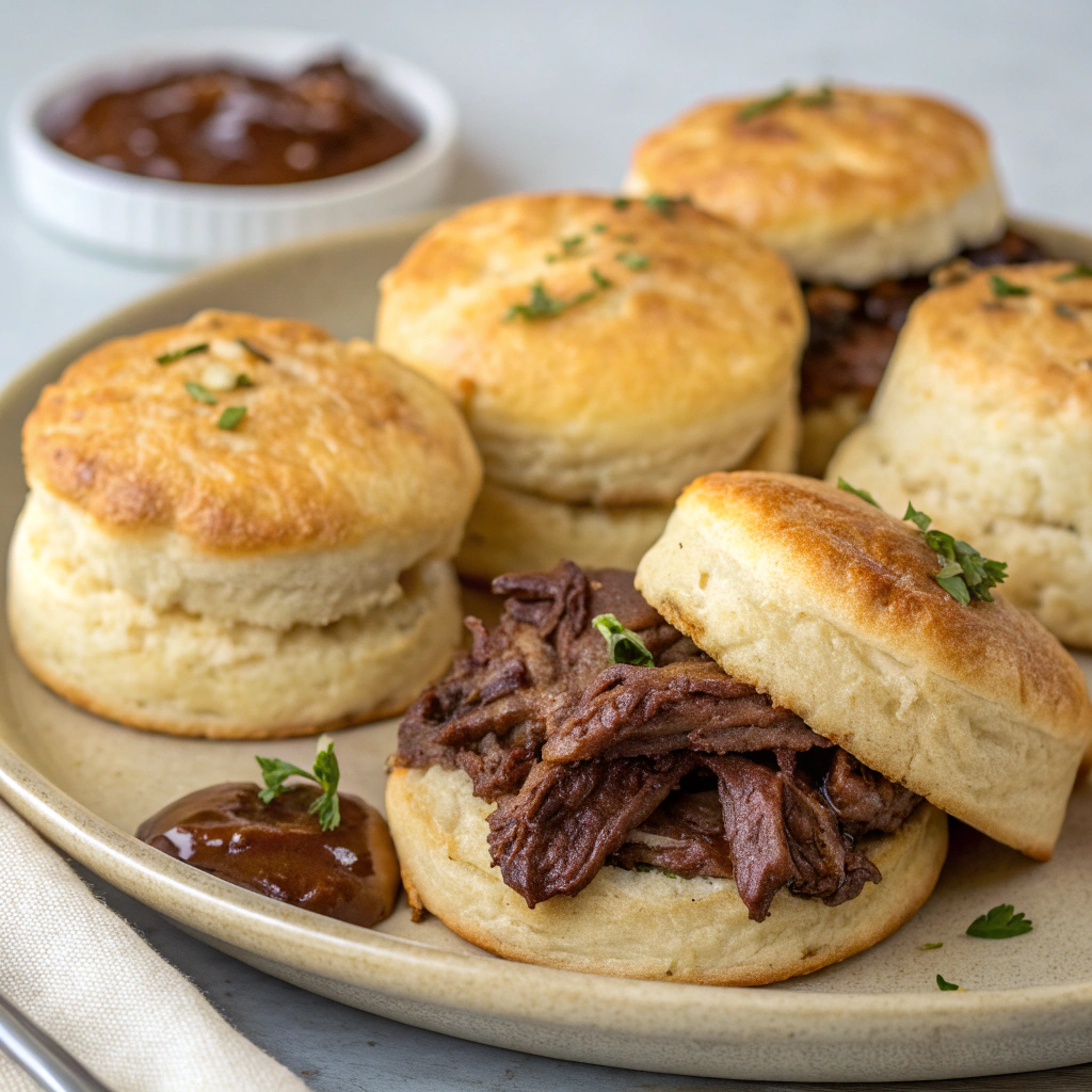 Pop the biscuits out of the tin, serve warm, and dip them generously in the au jus. Pure comfort in every bite.