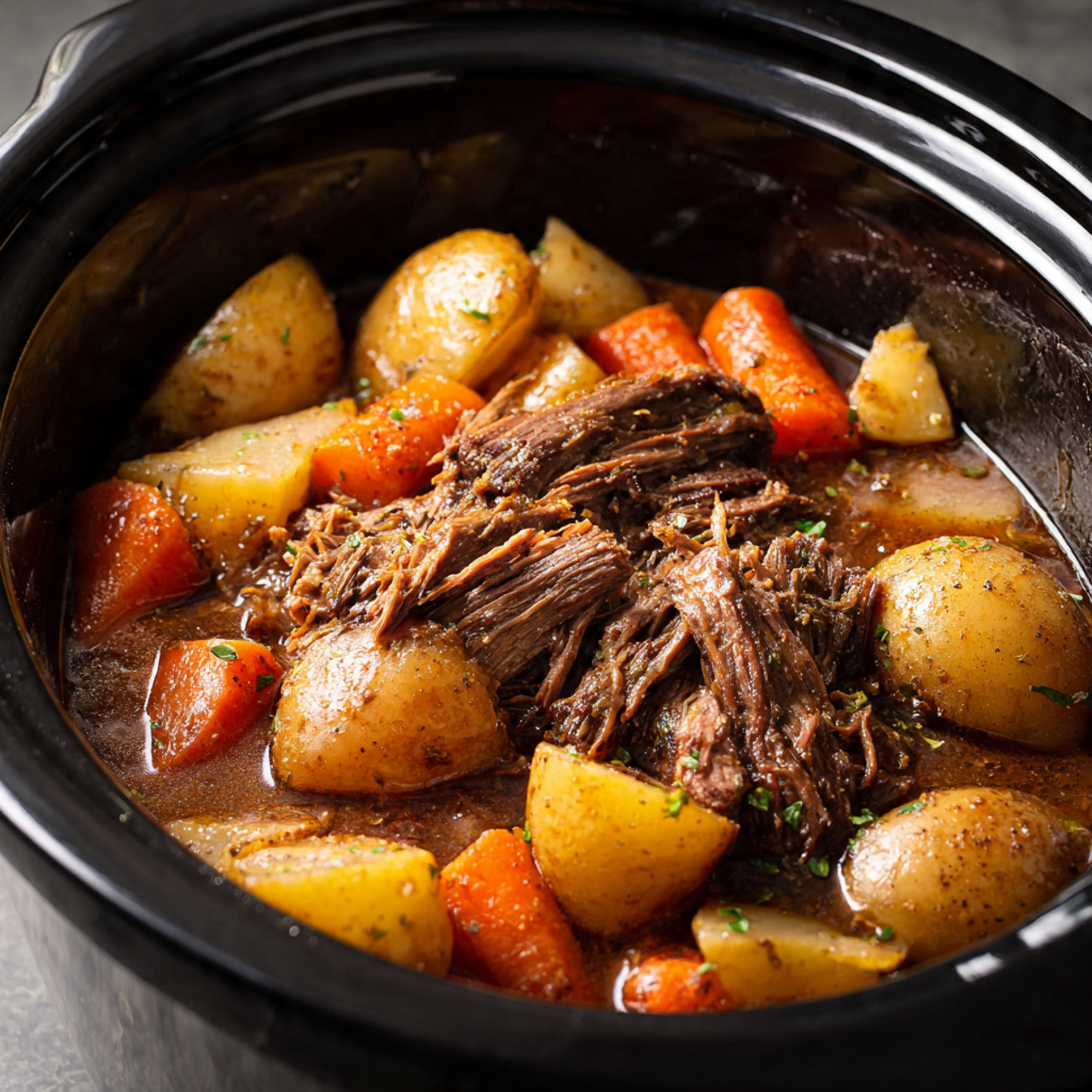 Cover and cook on LOW for 8–9 hours or HIGH for 5–6 hours, until the beef is fork-tender.