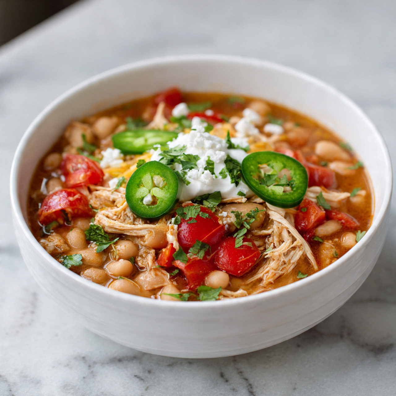 White chicken chili is naturally lighter than traditional chili, but still hearty enough to be filling. The slow cooker gently cooks the chicken until it’s tender and easy to shred, while the beans and broth create a creamy, comforting base. Because the ingredients are simple, the flavors come together without needing extra seasoning or steps.